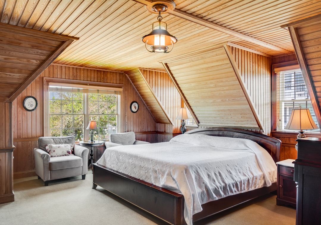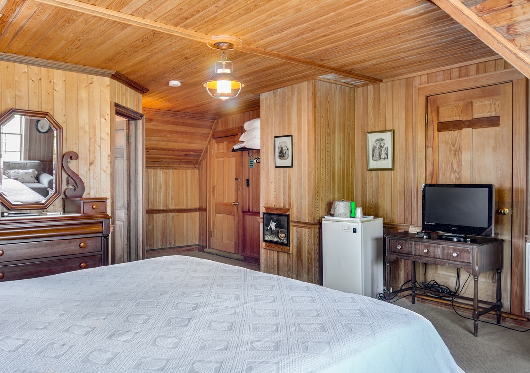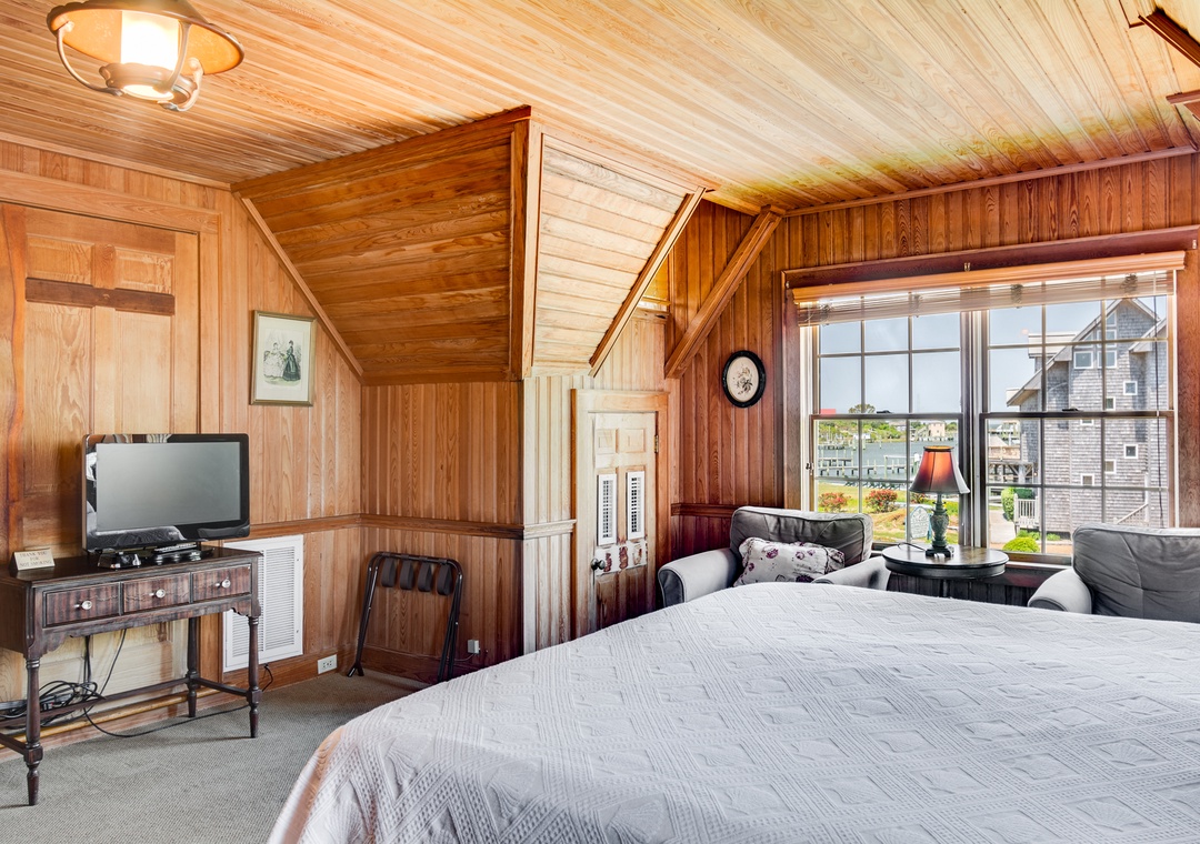BB08: The Lake Room is the most sought after room at The Castle Bed and Breakfast. In this corner room, you can enjoy a view of Silver Lake harbor while relaxing in the King bed. It has a large window that overlooks the front yard and Silver Lake Harbor. This room was originally a den but was remodeled to add a private bathroom with a whirlpool tub. The Lake Room comfortably sleeps 2.