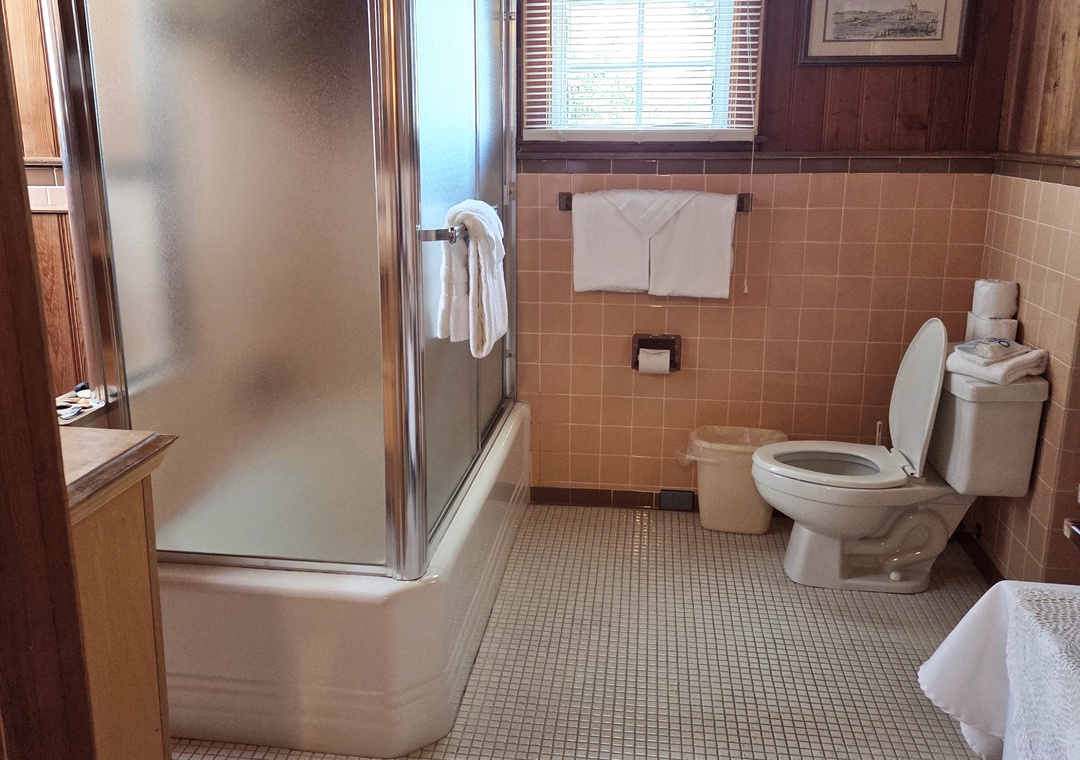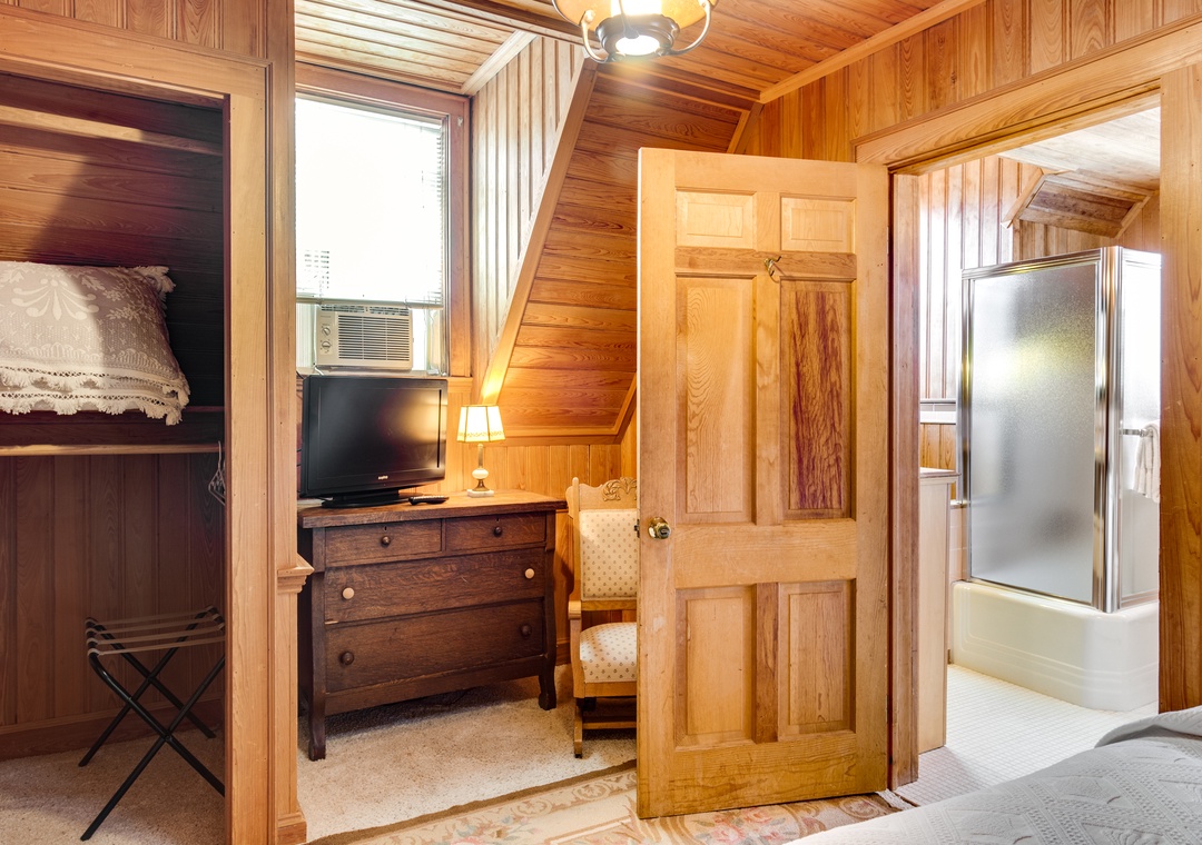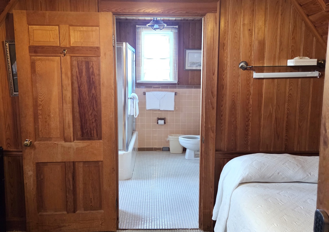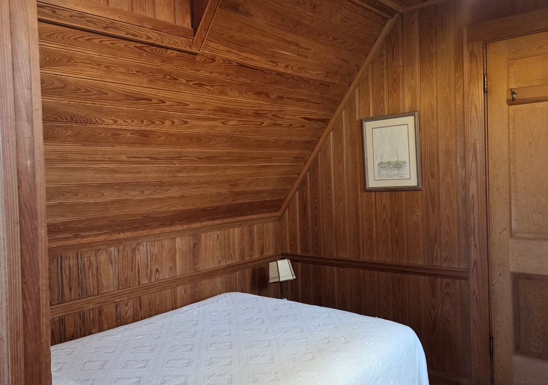 BB12: Webb's Room comfortably sleeps 2 and is the smallest bedroom in the house. The adjoining bathroom is actually a bit larger than the bedroom itself as in the earliest days of the Inn it was used as the Innkeeper's Quarters. Today it is named after one of the current owners. From 2005 to 2016 it was only used when every room on Ocracoke Island was sold out and became known as "the last hidden bedroom on the island". Located on the second floor center of the house, the room has a full bed under a low pitched ceiling with a TV and a window A/C unit. The bathroom has a tub with shower.