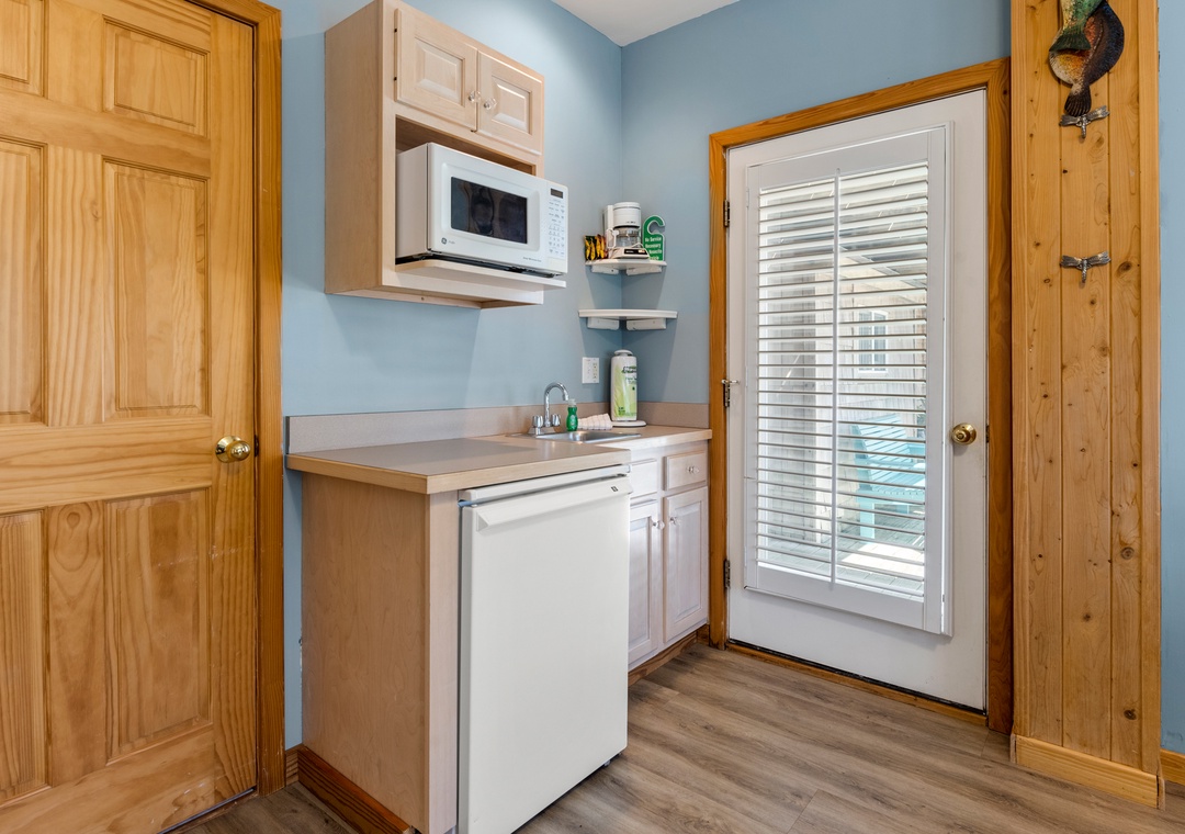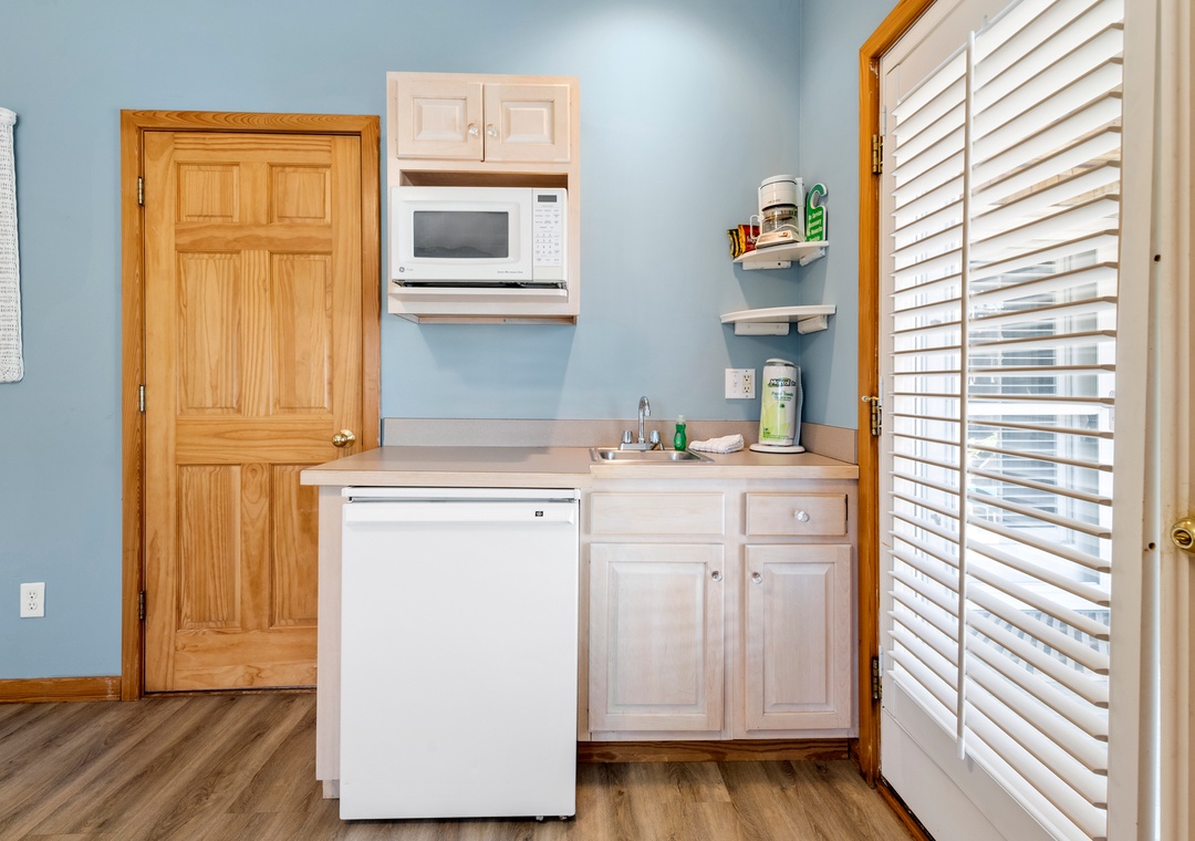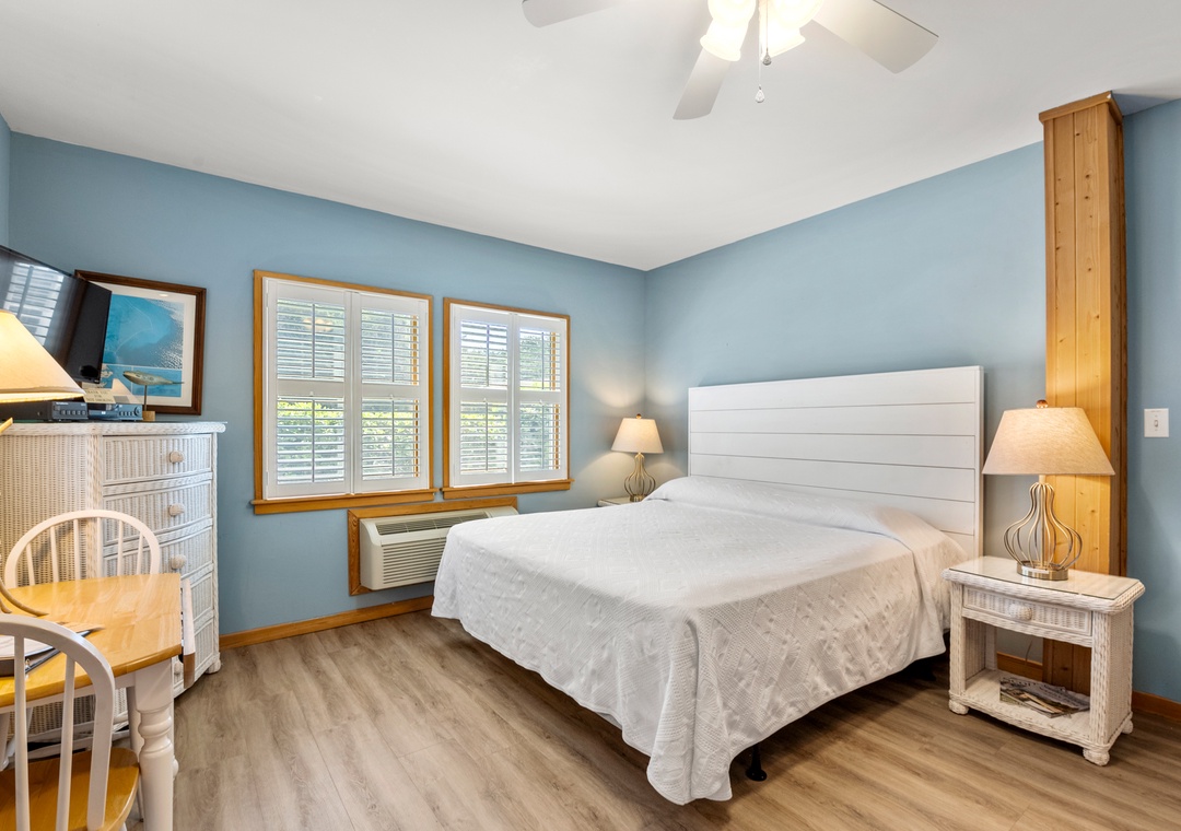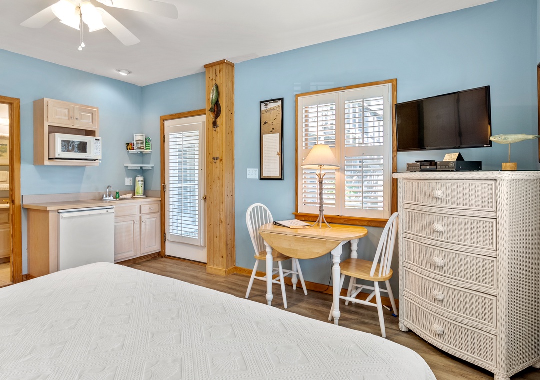 This first-floor studio offers a King Bed, full bath with whirlpool tub/shower, flat-screen smart TV, wireless internet access, phone, table with 2 chairs, and a kitchenette with toaster, mini-refrigerator, microwave, coffee maker, and sink.