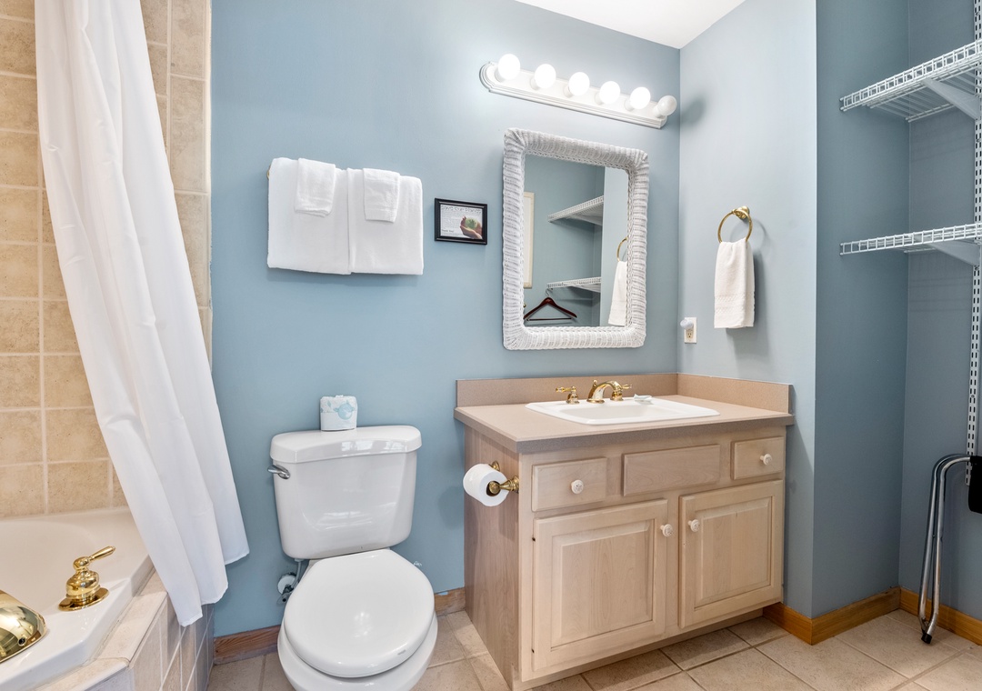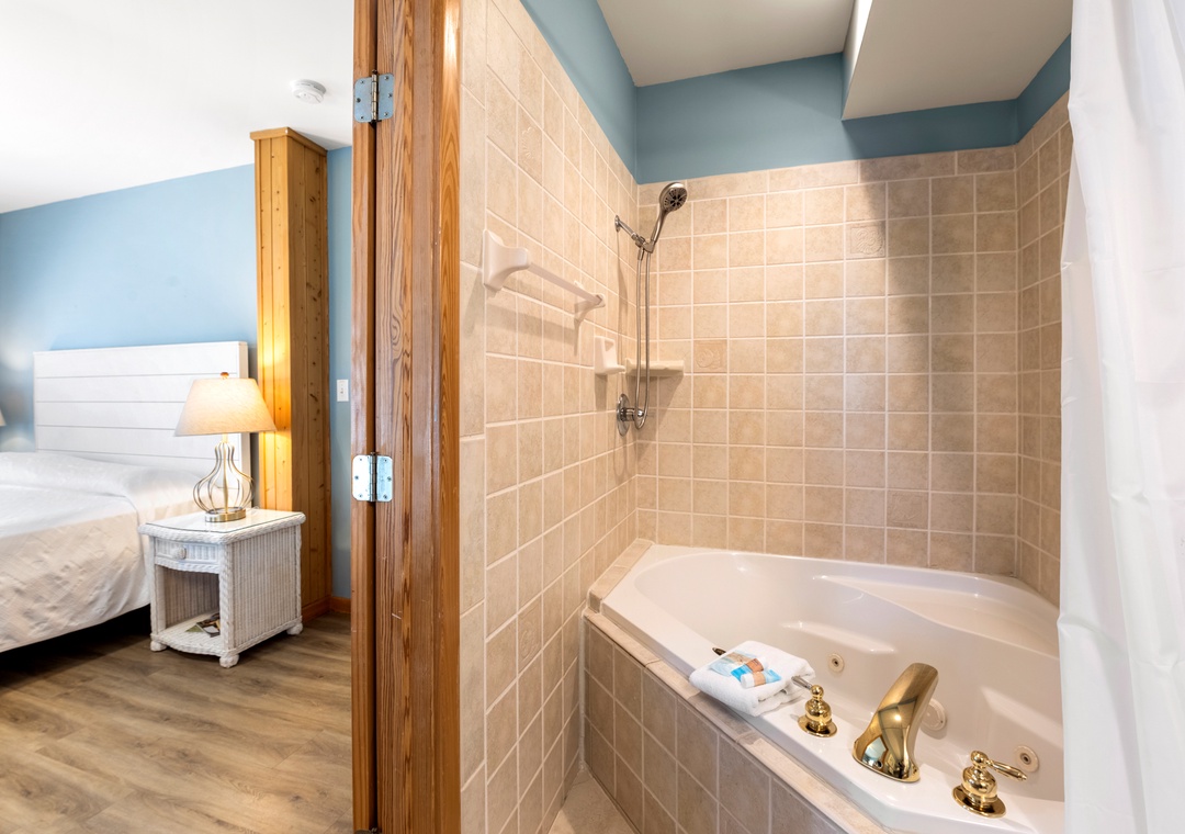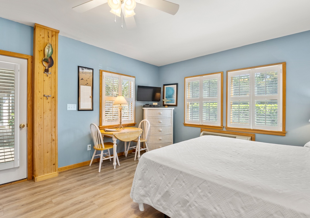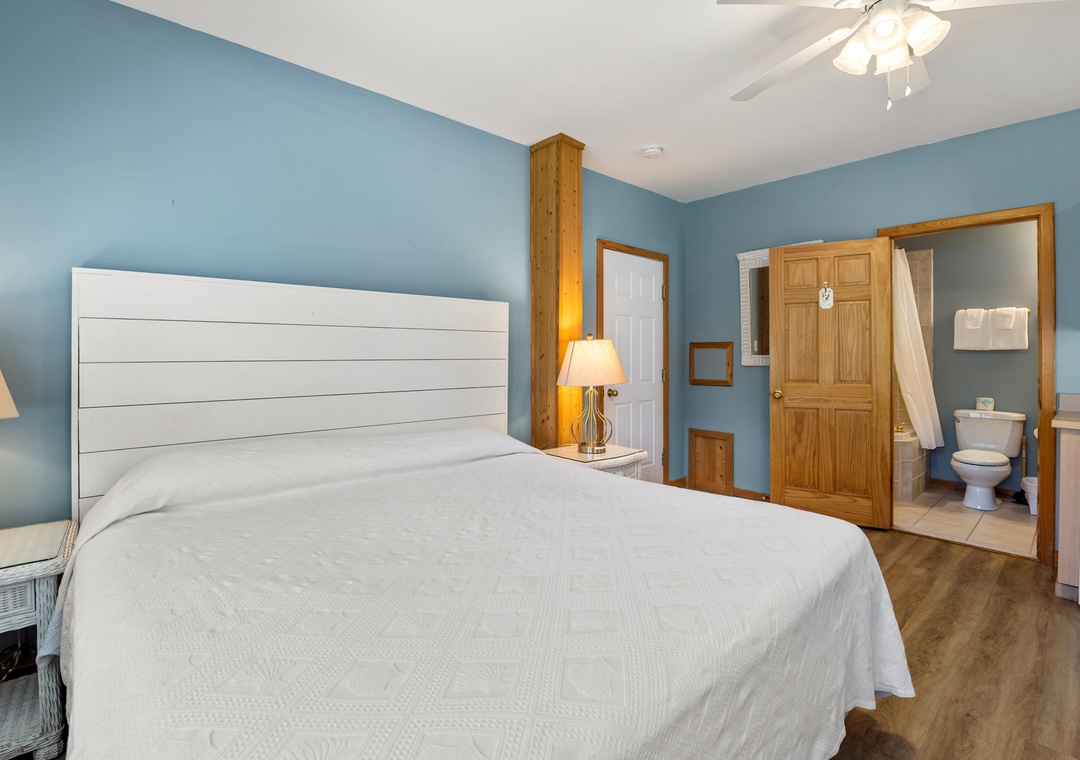 This first-floor studio offers a King Bed, full bath with whirlpool tub/shower, flat-screen smart TV, wireless internet access, phone, table with 2 chairs, and a kitchenette with toaster, mini-refrigerator, microwave, coffee maker, and sink.