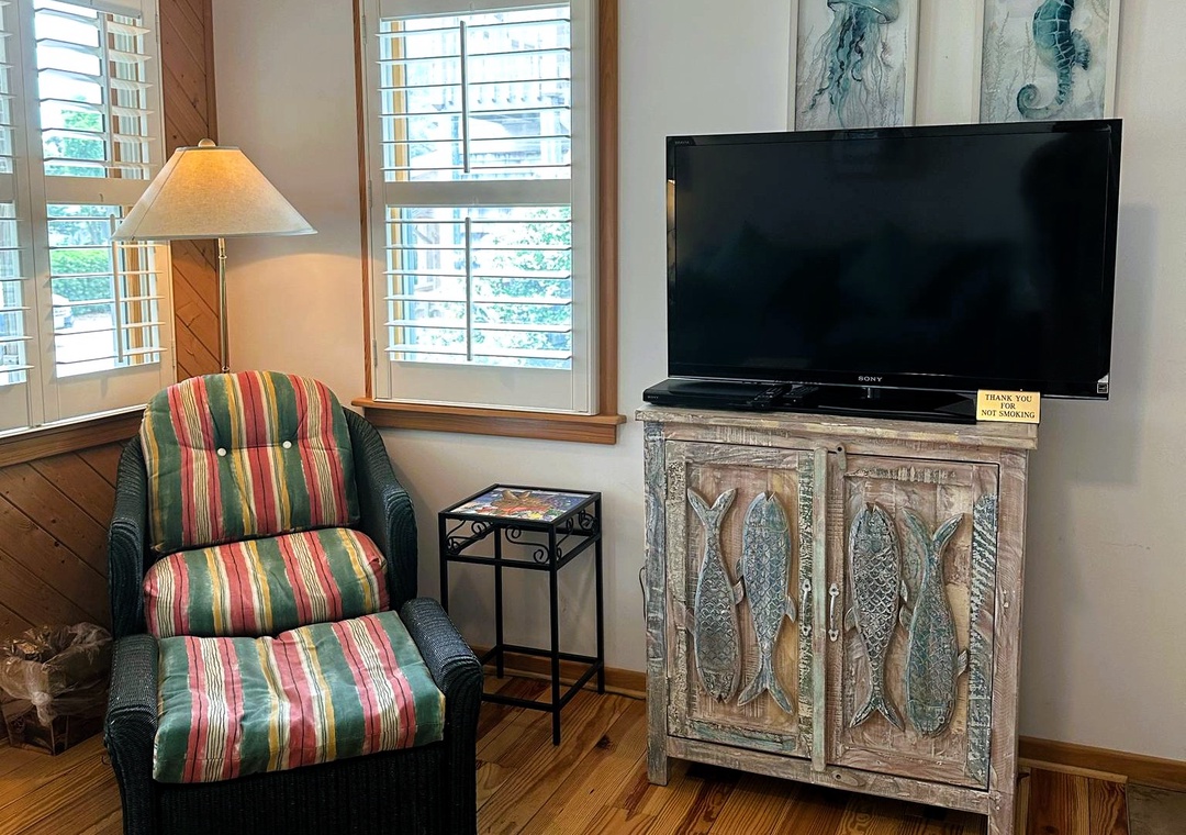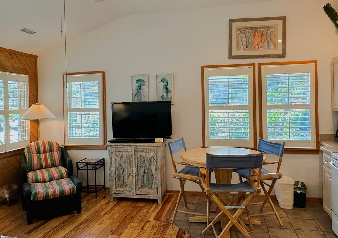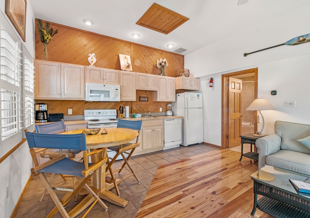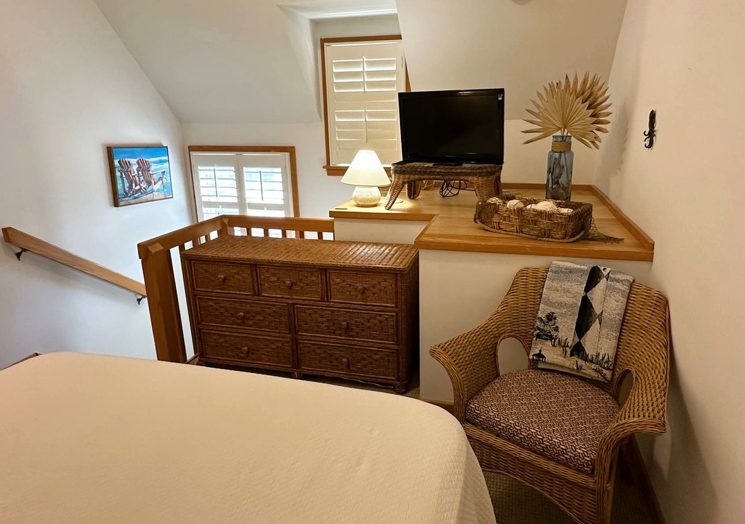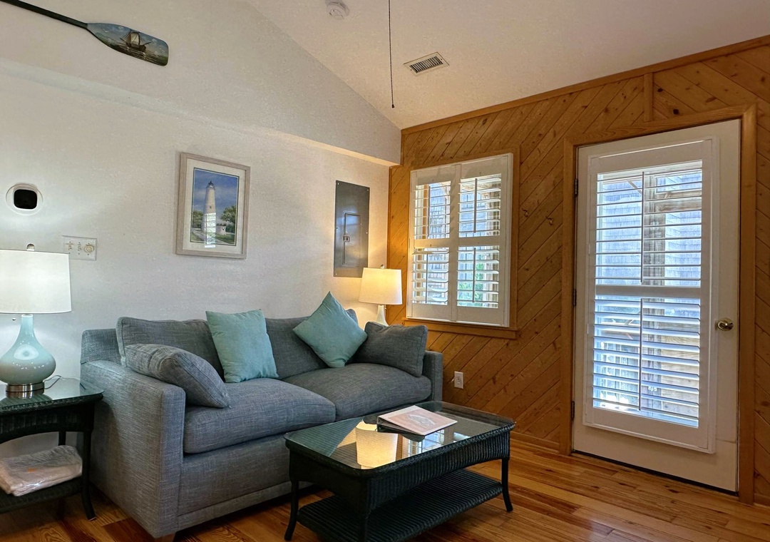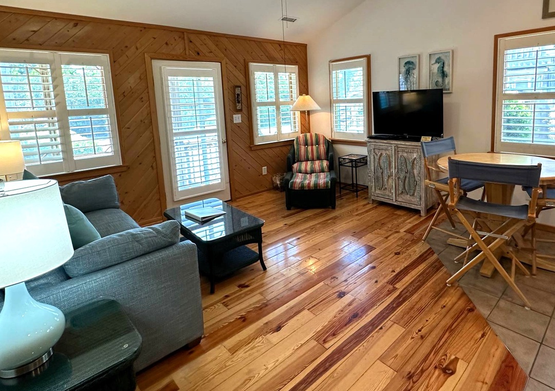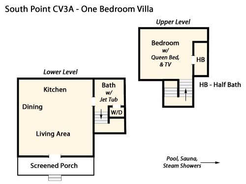 This two-story villa offers a great room style living space with sleeper sofa, dining area, and full kitchen on the lower level as well as a screened porch, washer/dryer, and full bath with tub and shower. The upper-level bedroom has a queen bed, TV, and a half bath. Other features include a sleep sofa in the living area, wireless internet access, and a phone.