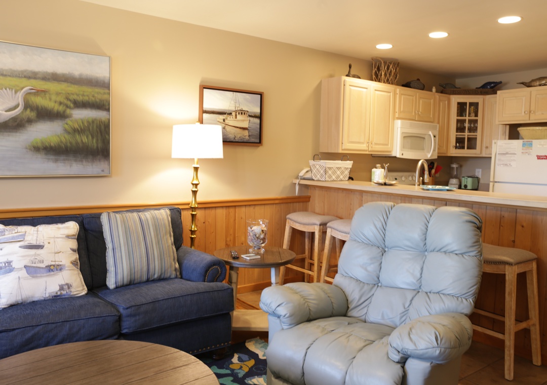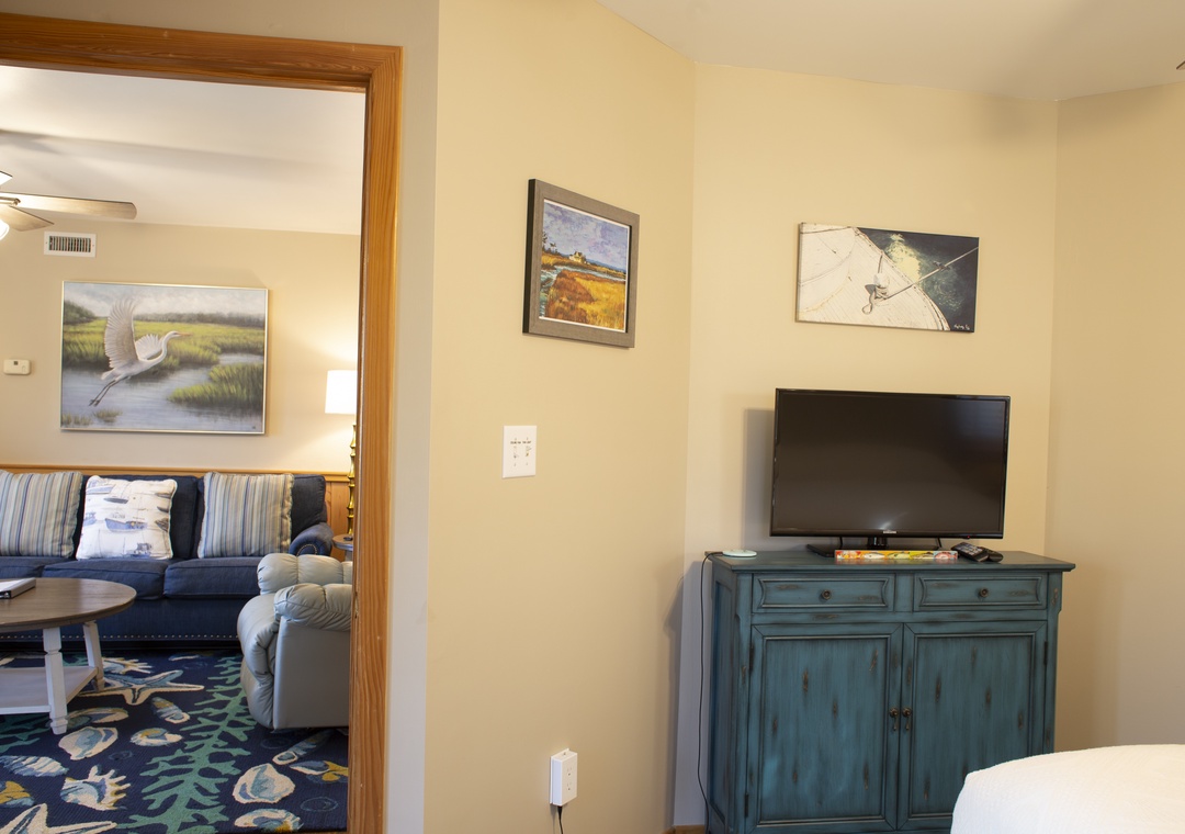 This first floor two bedroom, two bath villa offers a view of Silver Lake from the screened porch, a large living area with TV and single sleeping sofa, a full kitchen with bar and table seating, washer/dryer, and wireless internet access.