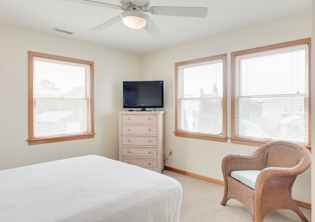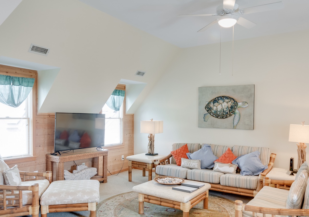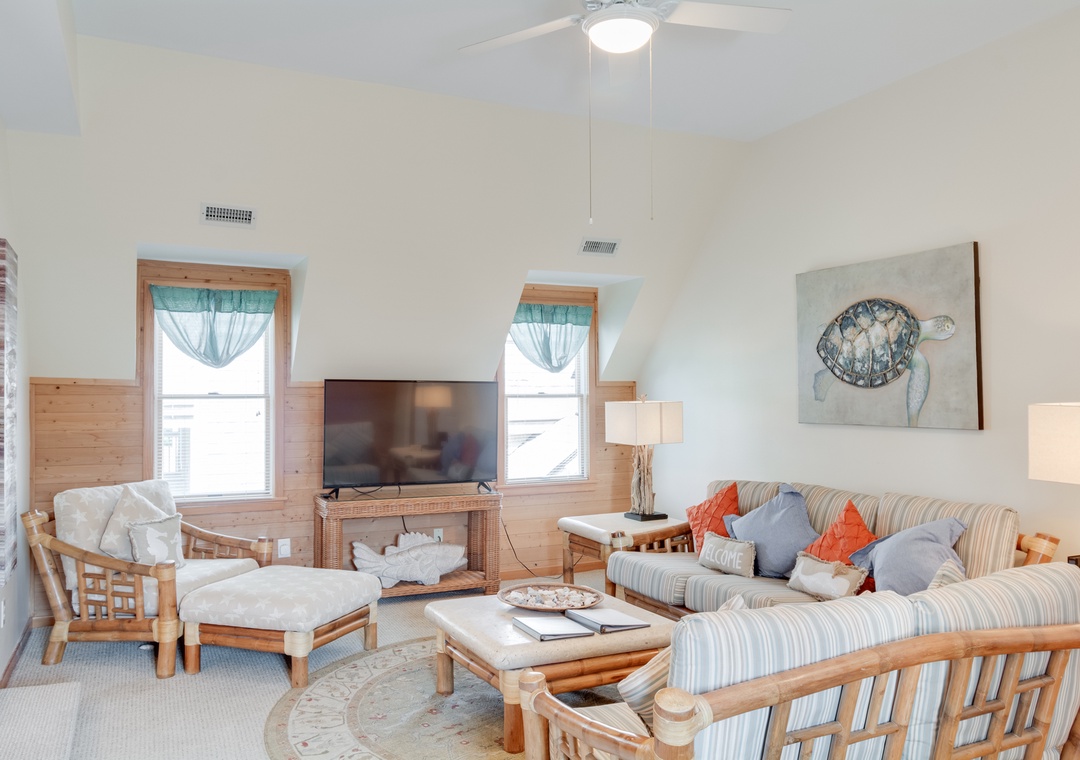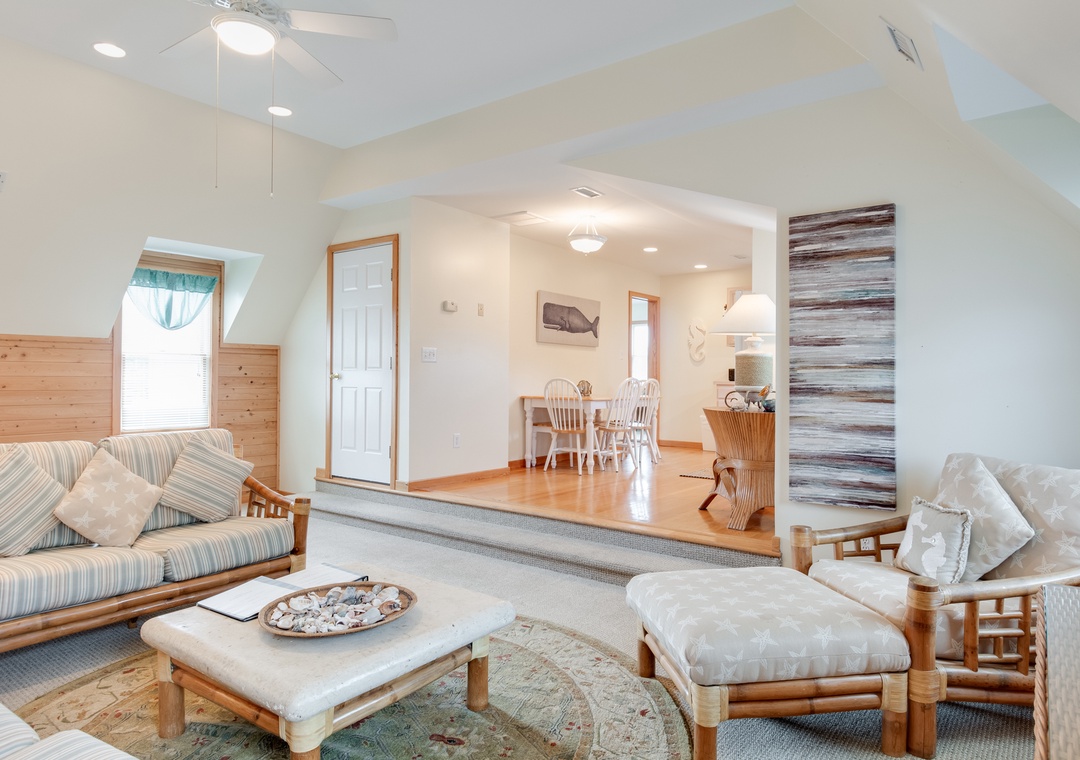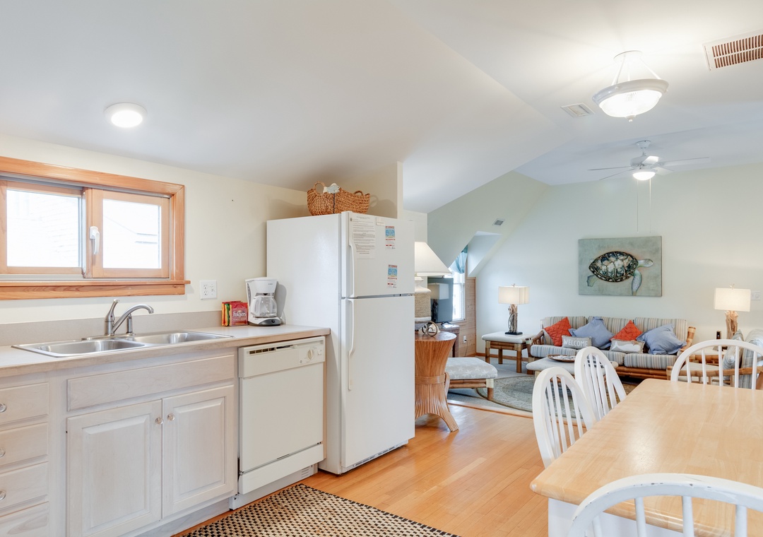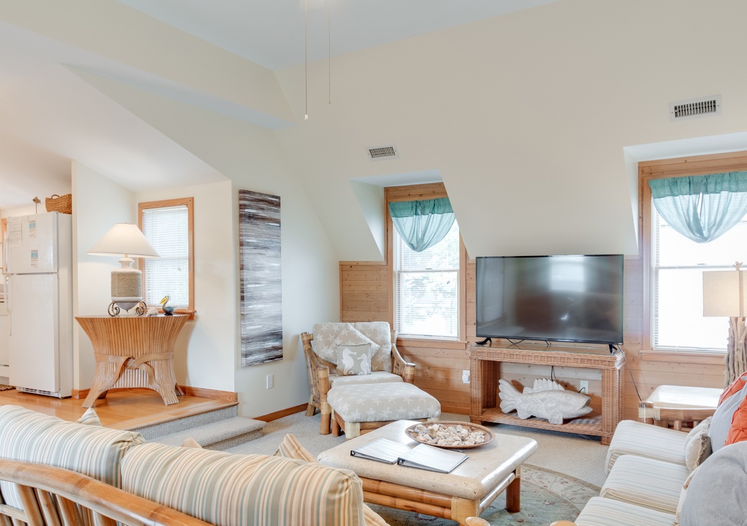 This second-floor villa offers a large living area with TV, full kitchen with dining table, queen bedroom with TV, spacious bath with whirlpool tub and separate glass shower, washer/dryer, wireless internet access, and phone.