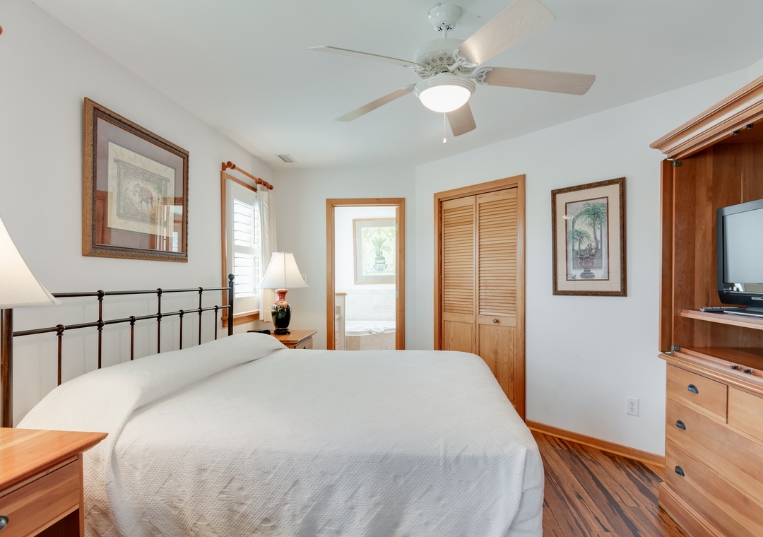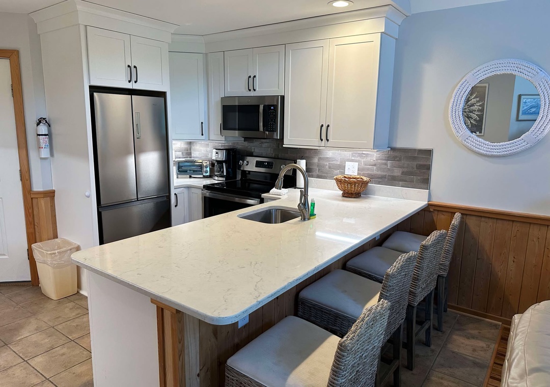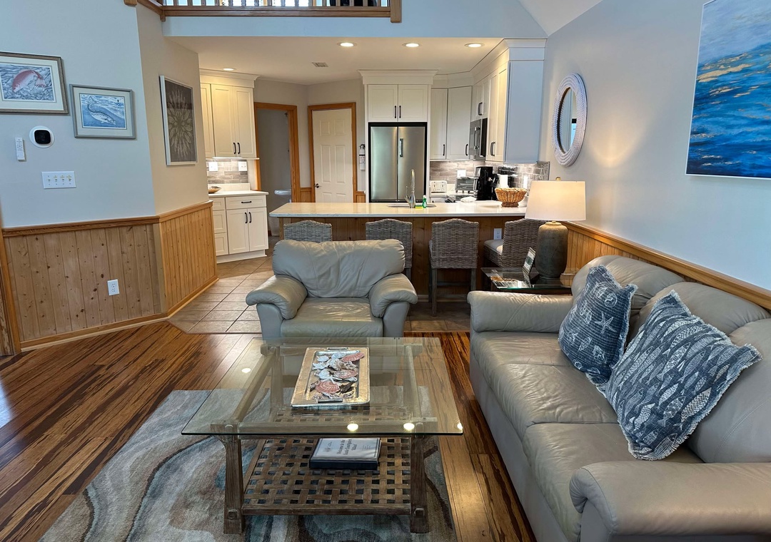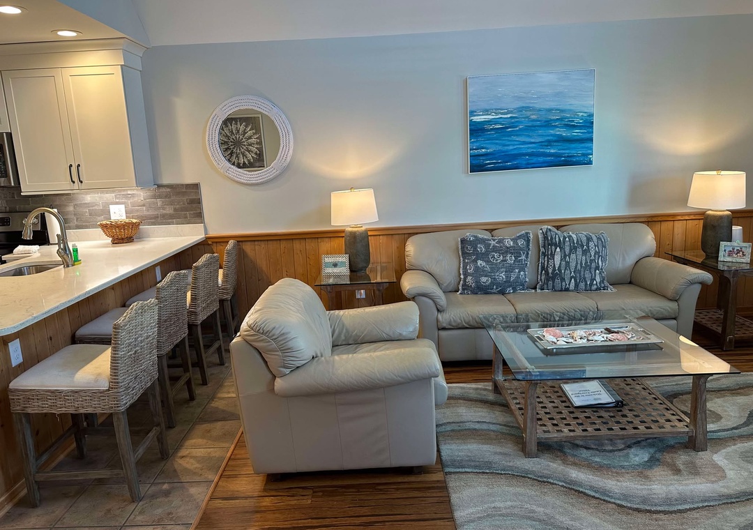 This second floor two bedroom, two bath villa offers a spacious living area with big screen TV, full kitchen with bar and table seating, screened porch with a limited view of the harbor, washer/dryer, wireless internet access, and phone.