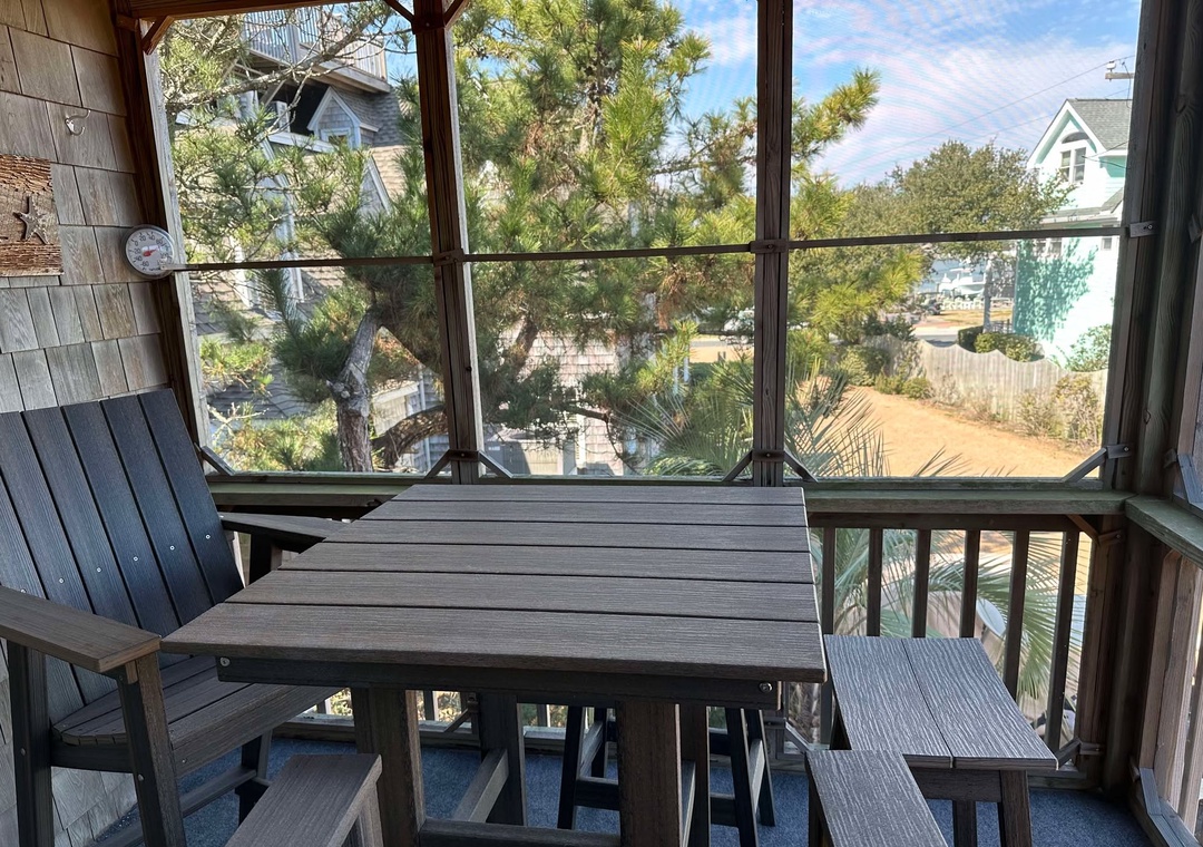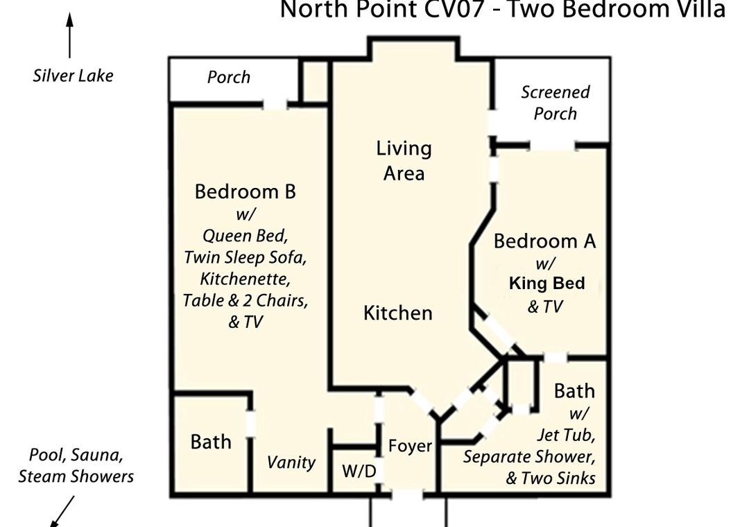Bedroom A has a King Bed, TV, DVD, screened porch access, and a full bath with a tiled walkin shower. Bedroom B has a Queen Bed, Twin Sleeper Sofa, porch access, TV, DVD, table with two chairs, and a kitchenette with toaster, mini-refrigerator, microwave, coffee maker, and sink.
