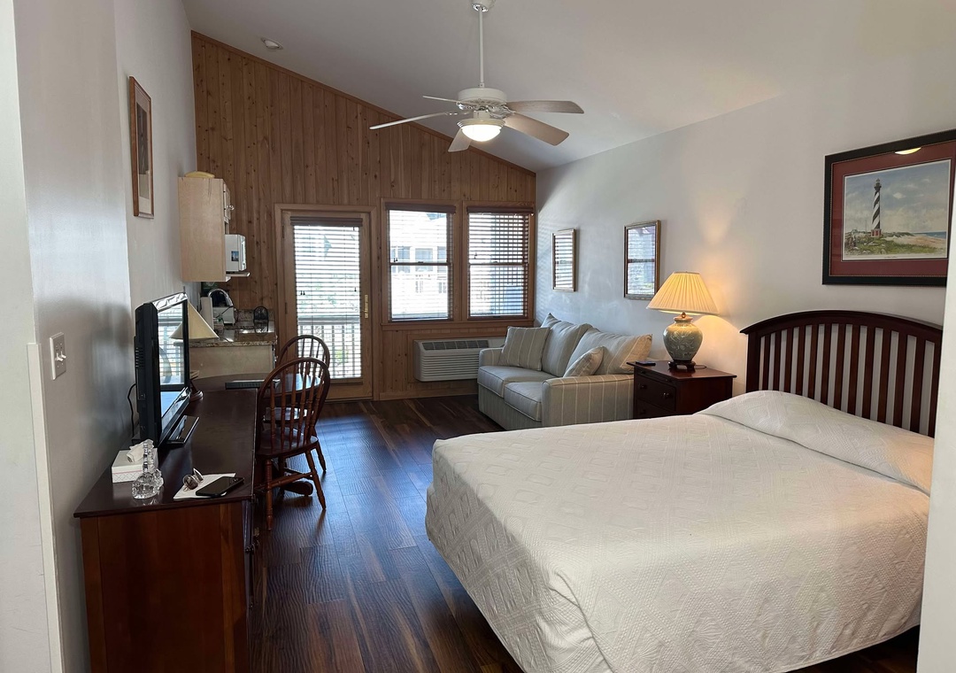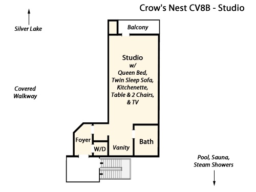 This second floor studio has a Queen Bed, Twin Sleeper Sofa, full bath with tub/shower, TV, wireless internet access, phone, balcony with a limited view of Silver Lake, table and two chairs, washer/dryer access, and kitchenette with toaster, mini-refrigerator, microwave, coffee maker and sink.