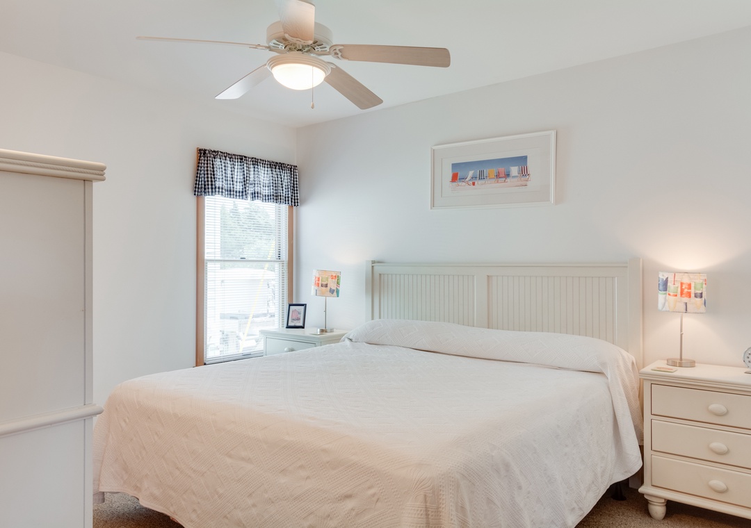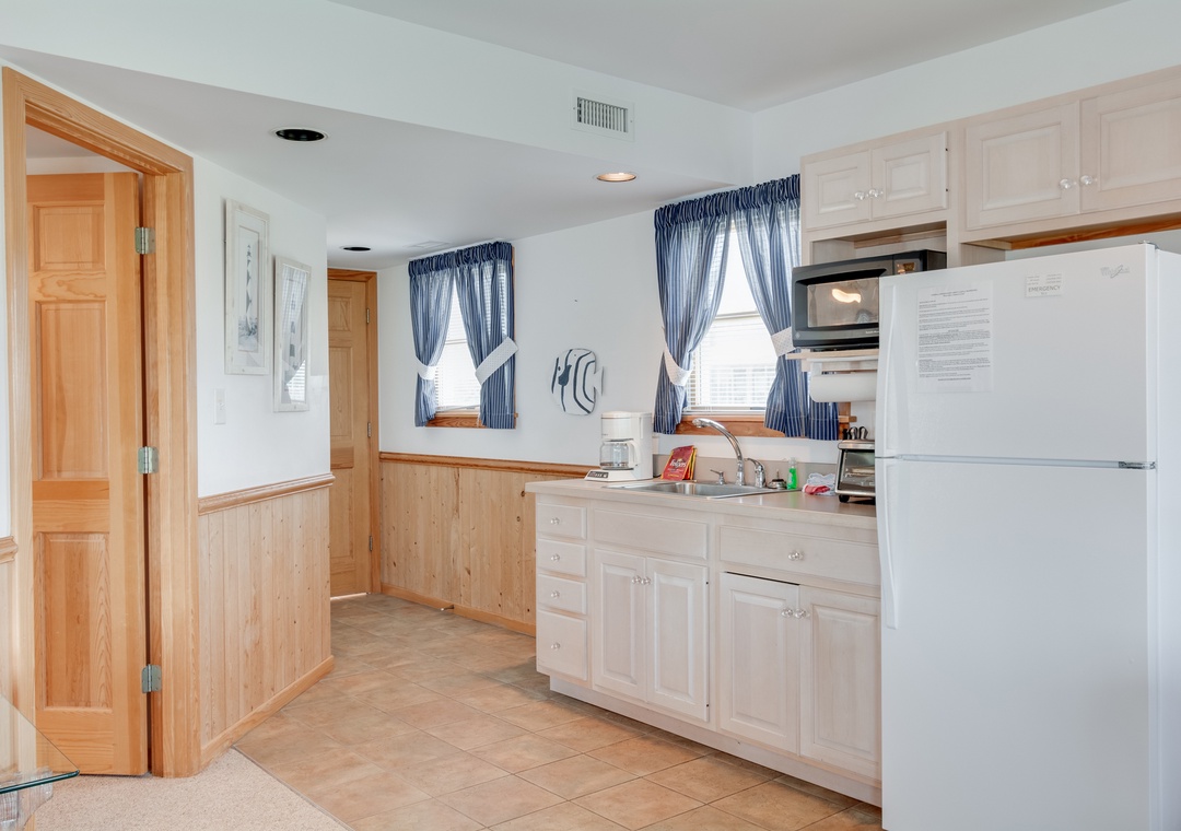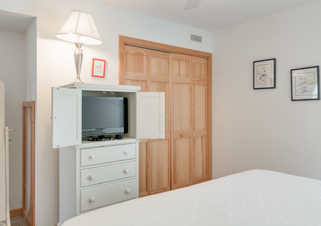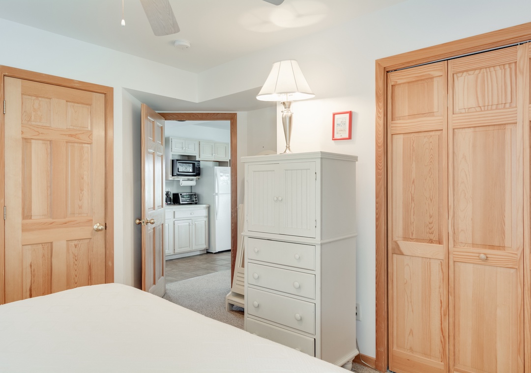 Bedroom B on the lower level has a king bed, full bath, TV, screened porch, and kitchenette with full refrigerator, electric skillet, microwave, toaster, coffee maker, and sink. This bedroom also has direct exterior access.