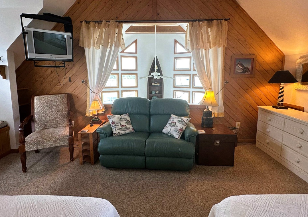 Bedroom A on the upper level has a king bed, TV, and bath. There is also a second story loft open to the first floor, with 2 twin beds, full bath with shower only and a mini-fridge, sink, TV and small sitting area.