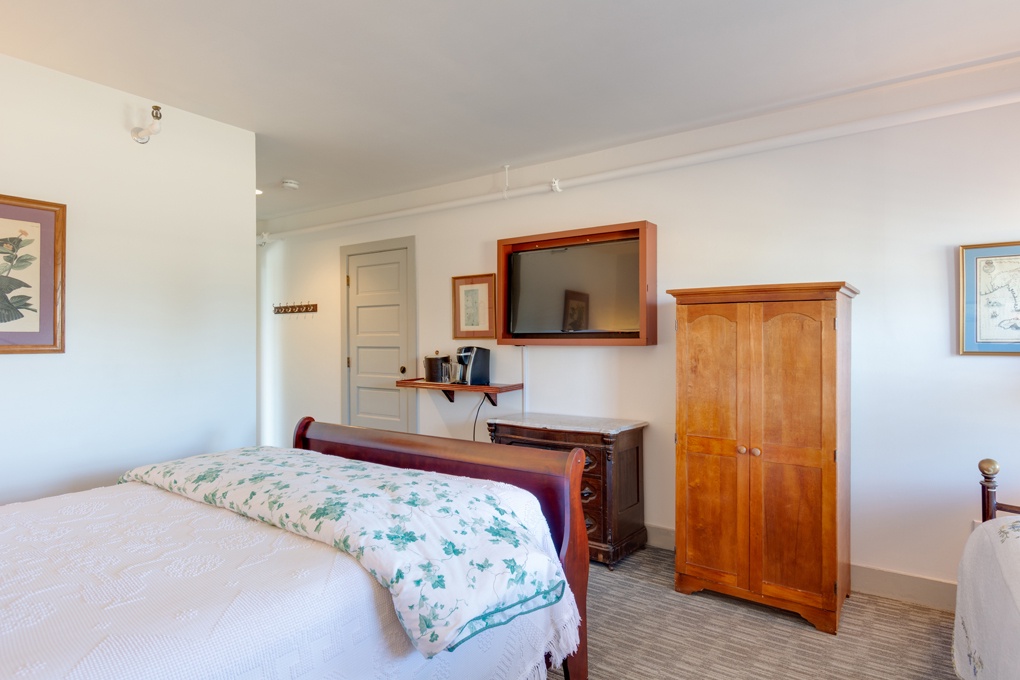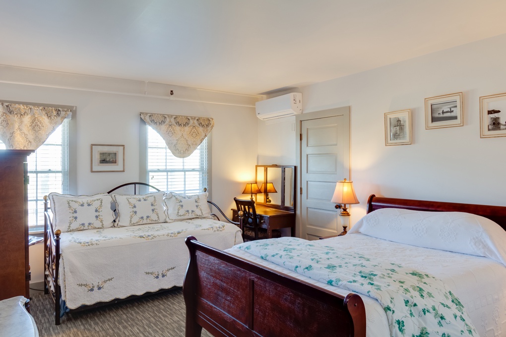 The Alis Chapman Room has a queen-sized bed. There is also a day bed with a trundle bed below. The room has a refrigerator, microwave, flat screen television. Other features include an in room safe, private bathroom and heated towel bar. Room 3 is on the 1st Floor, northwest center, and connects to Room 2 and Room 4. Additional room features include a Keurig coffee maker, hair dryer, iron and ironing board.