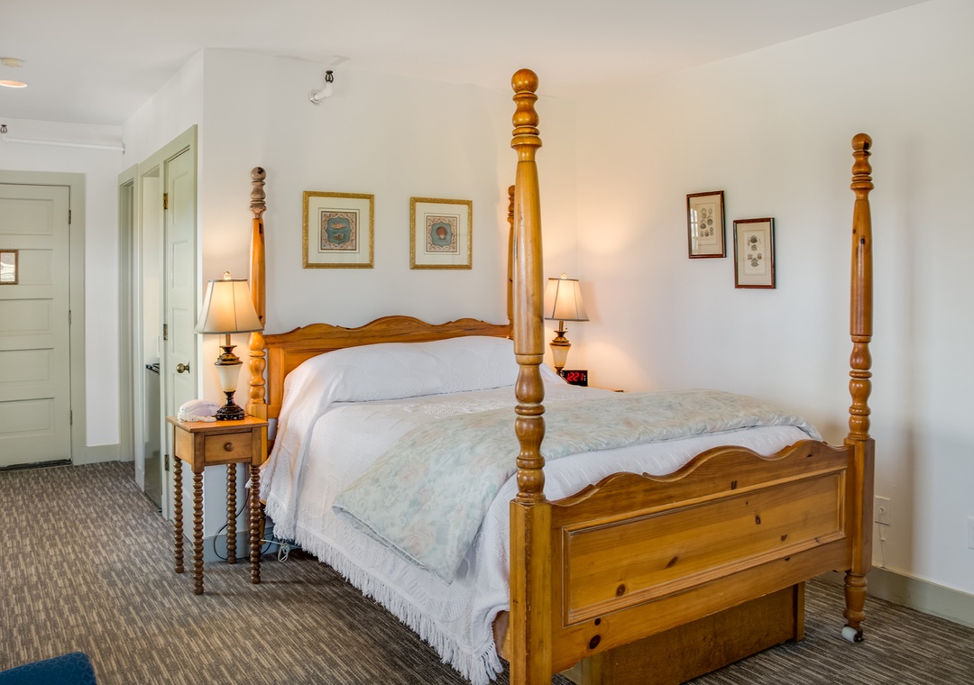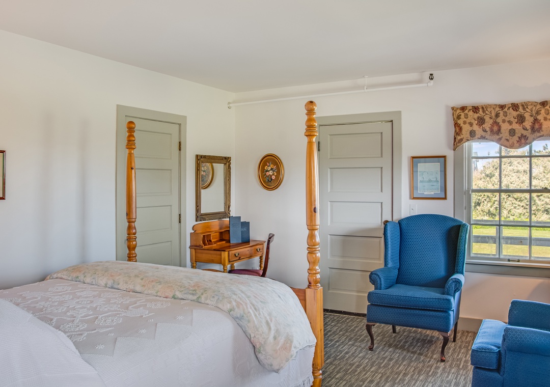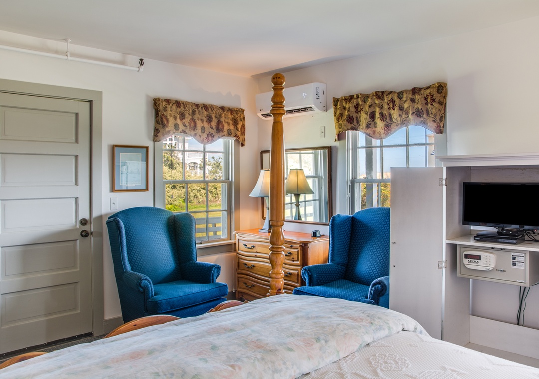 The William Dutton Room has a queen-sized 4-poster pine bed as well as a trundle bed. Amenities include a refrigerator, microwave, flat screen television, in room safe, private bathroom and heated towel bar. Room 4 is on the 1st Floor, northeast corner, on the ocean side and connects to Room 3. Additional room features include a Keurig coffee maker, hair dryer, iron and ironing board.