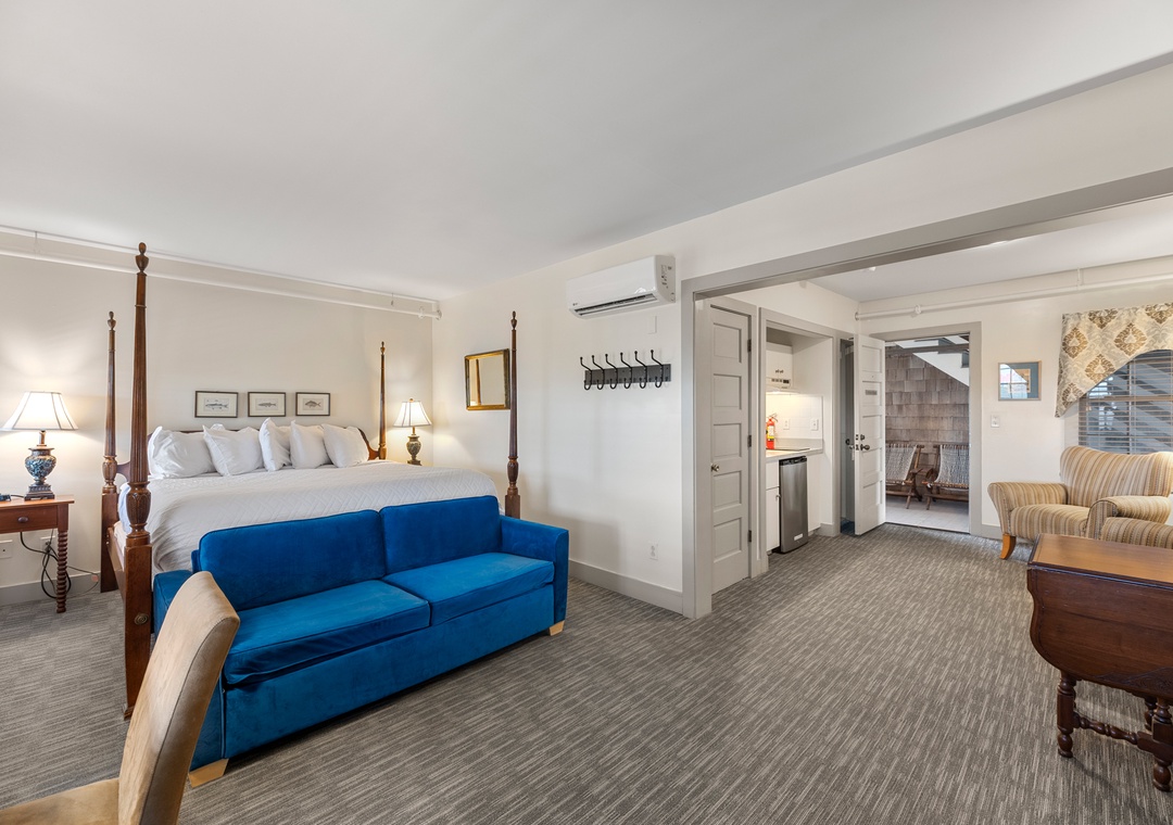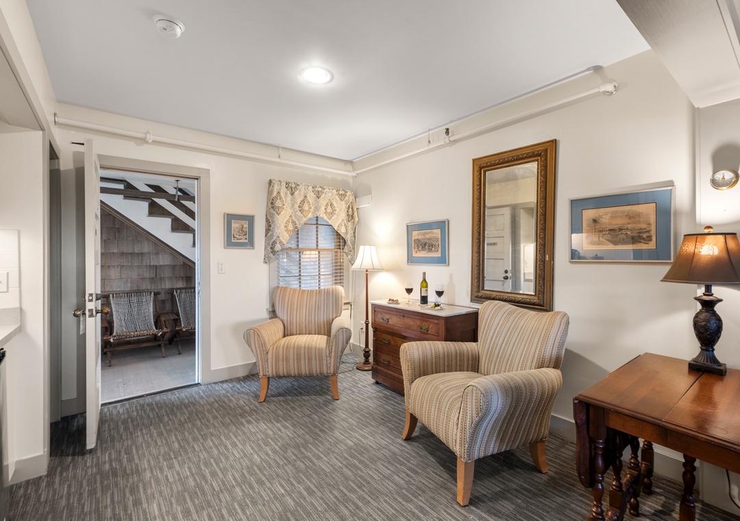 The Richard Kemme Room is a suite that features a king-sized rice carved bed with a trundle bed below, and a sleeper sofa in the adjacent sitting area. There is a flat screen television and bathroom with Jacuzzi, separate toilet and shower room. It is located on the 2nd Floor, south center. The suite's sitting area has comfortable upholstered armchairs, a sleeper sofa, and a small kitchenette with wetbar, dishwasher, cooktop, microwave, and refrigerator. Tiled bathroom with two-person Jacuzzi, pedestal sink, and heated towel bar. The toilet and shower are in a separate, adjoining room. Additional room features include a Keurig coffee maker, hair dryer, iron and ironing board.