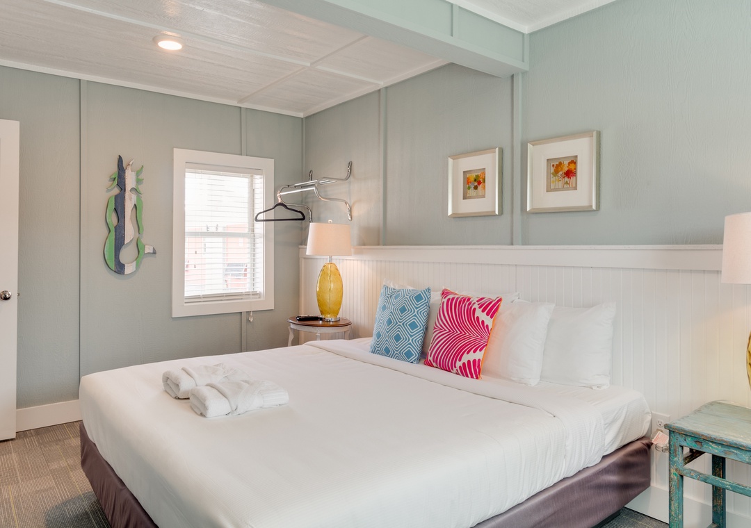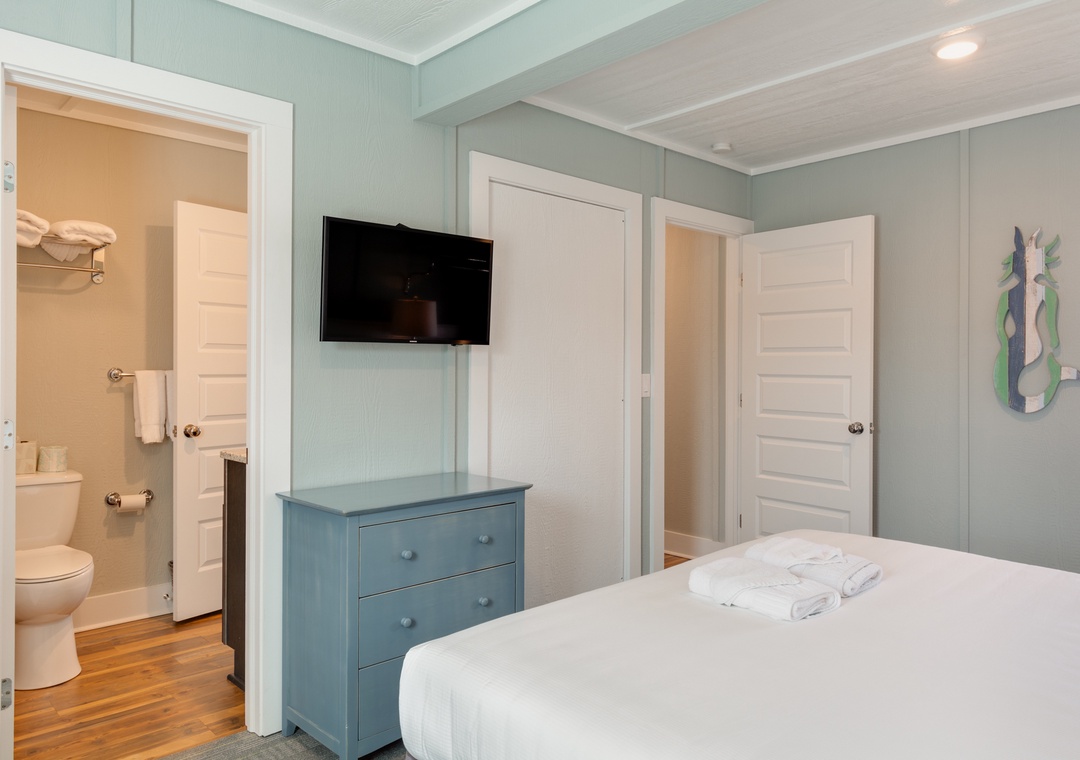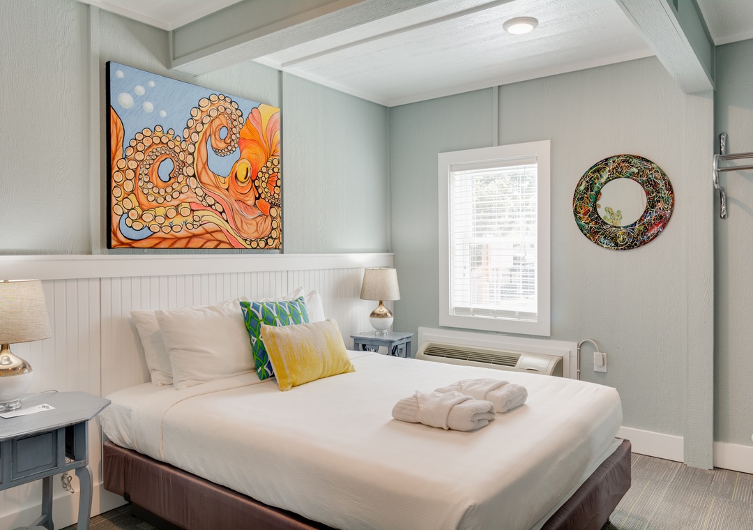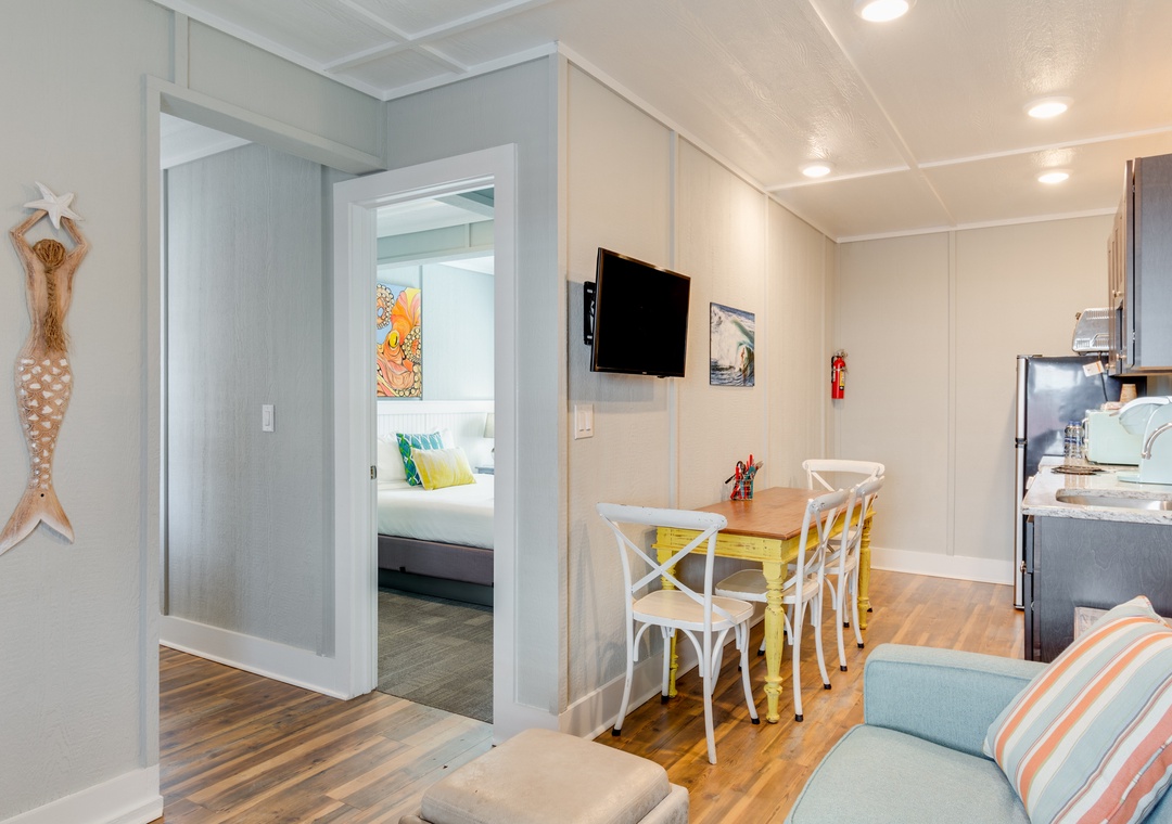 This is a two-bedroom suite, featuring a full kitchen with full-sized fridge, microwave, coffee maker and convection toaster oven. Bedroom 1 is a King and Bedroom 2 is a queen bed, and the living area features a queen sleep sofa.