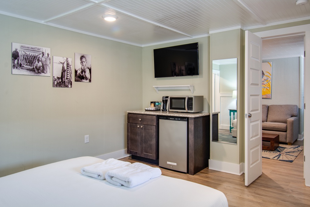 The Diamond Shoals Suite offers a living area, full kitchen, dining area and two bedrooms, one with a king bed and one with a queen. The living room features a sleep sofa. Enjoy plenty of space to spread out on your next visit to the Tar Heel!