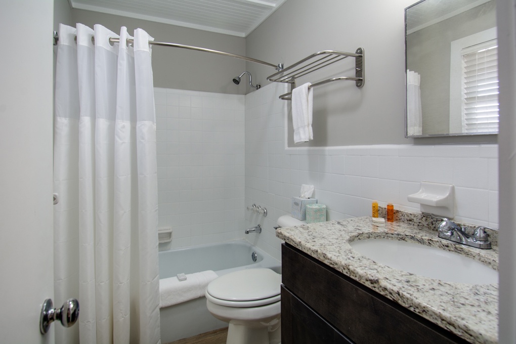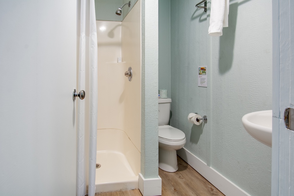 The queen bedroom has a private bathroom with standup shower, and it's own microwave, mini-fridge and mini-convection oven.